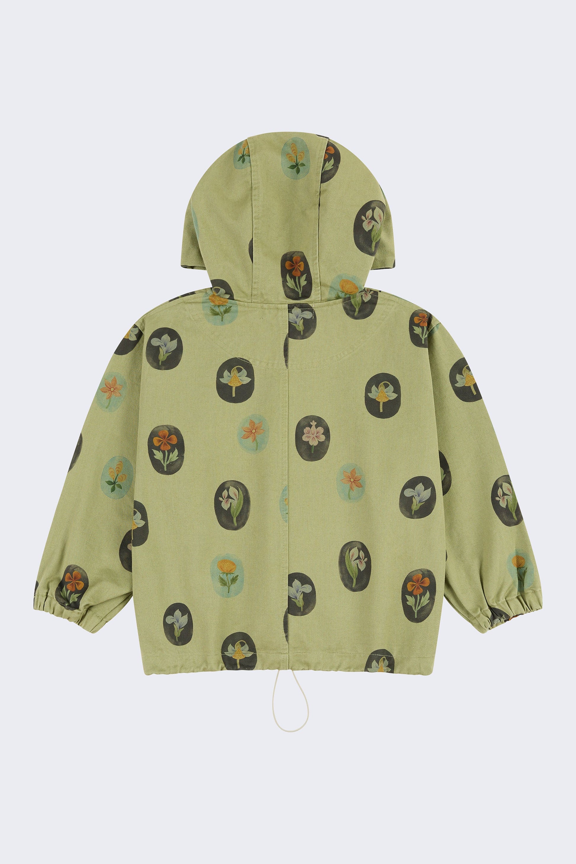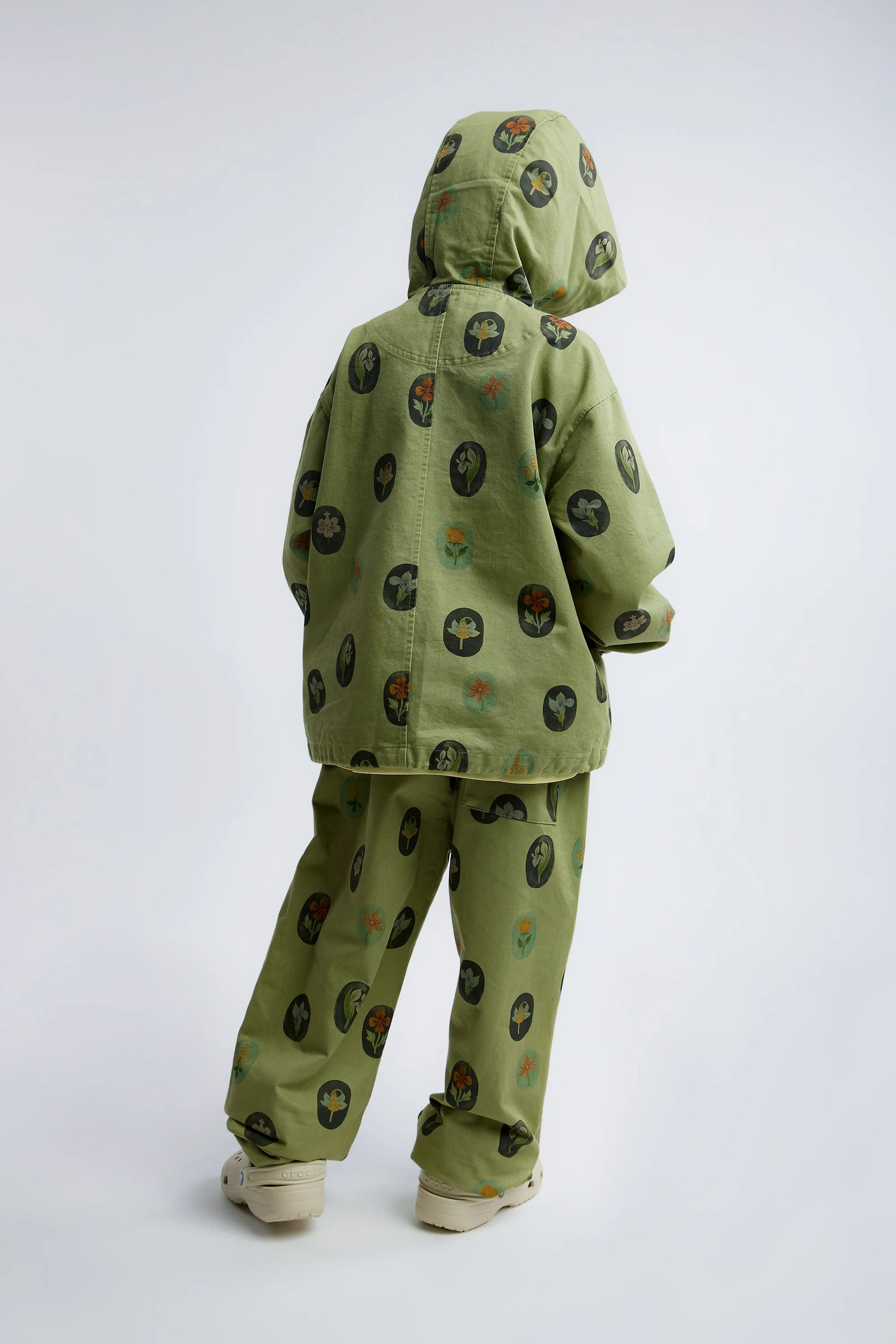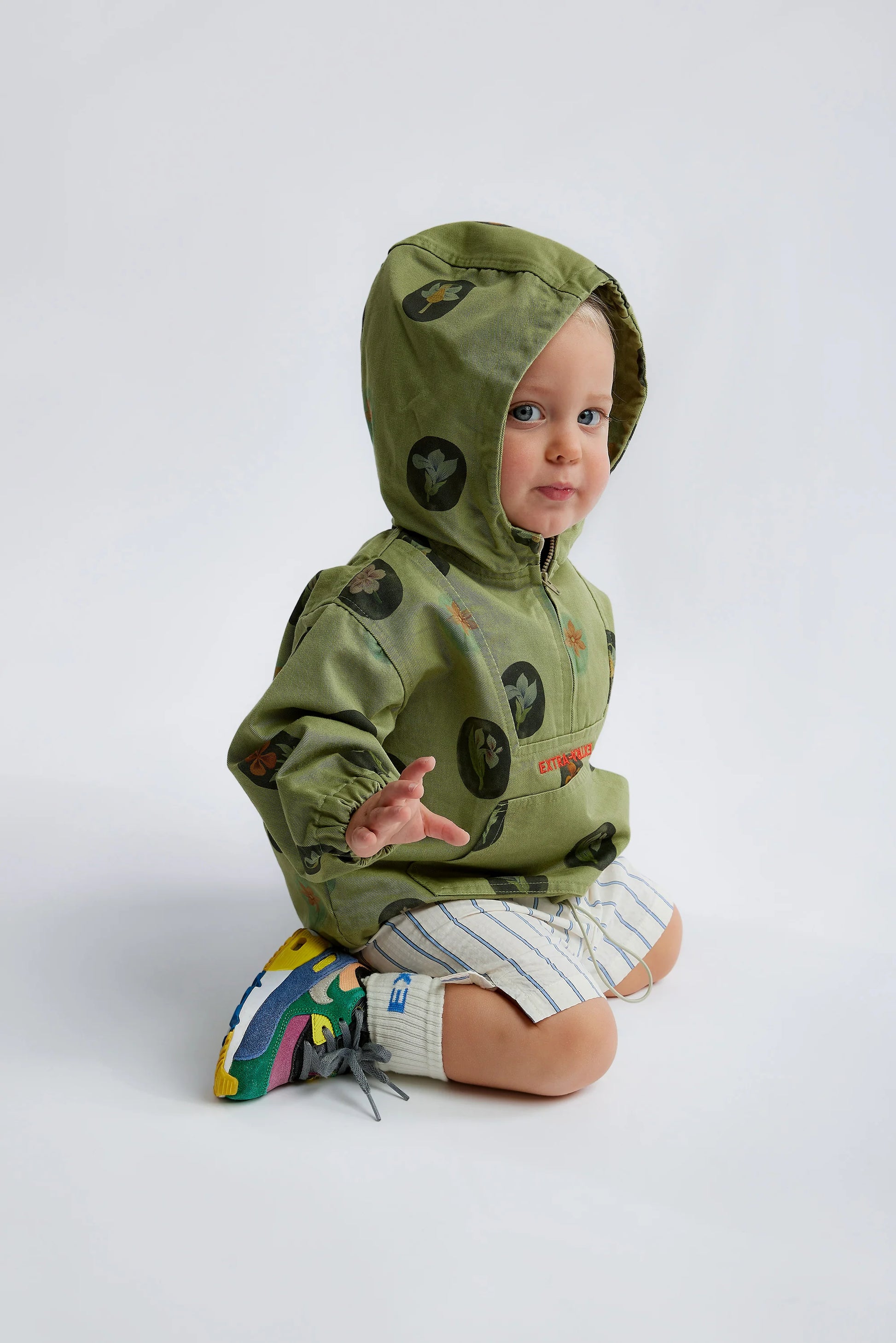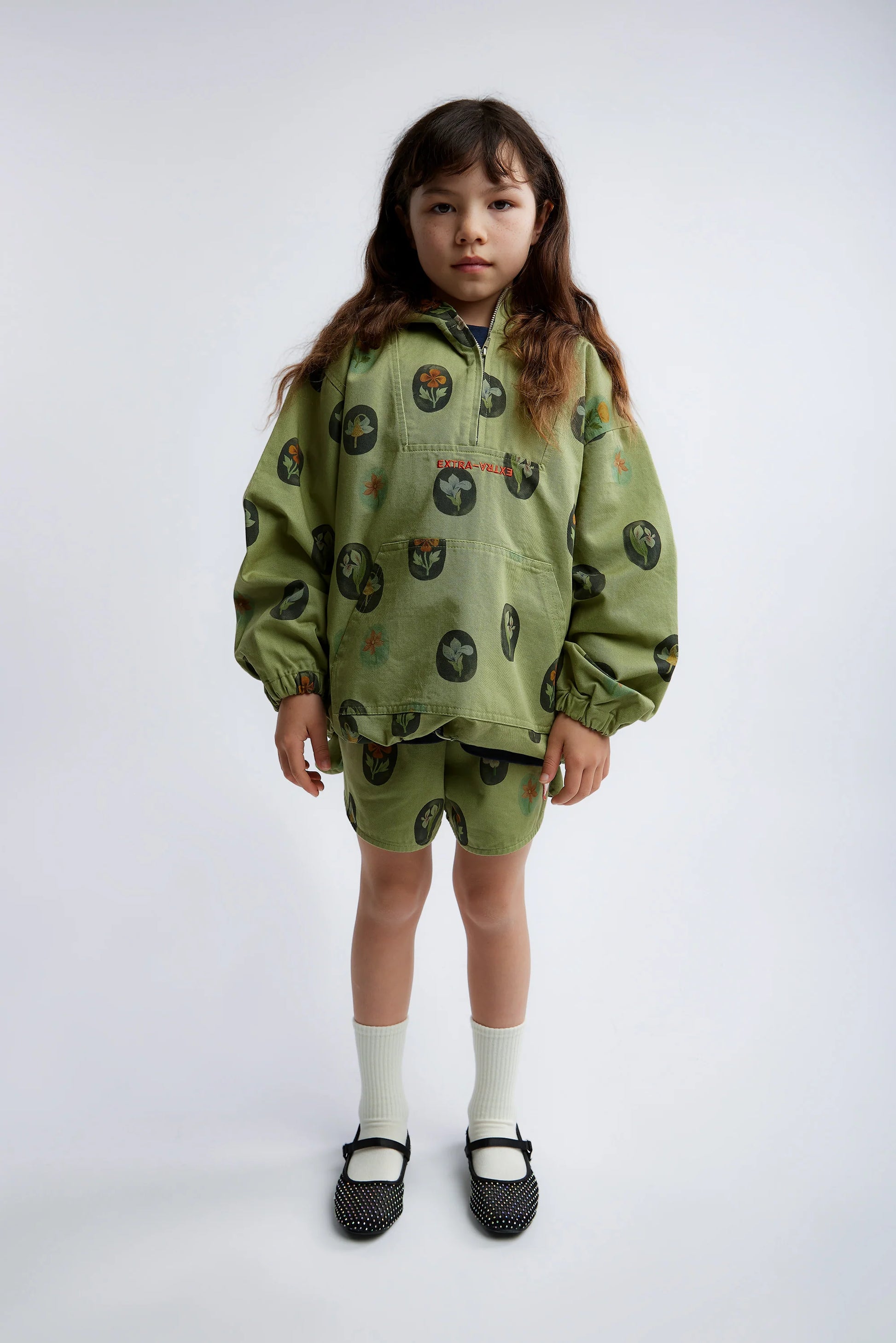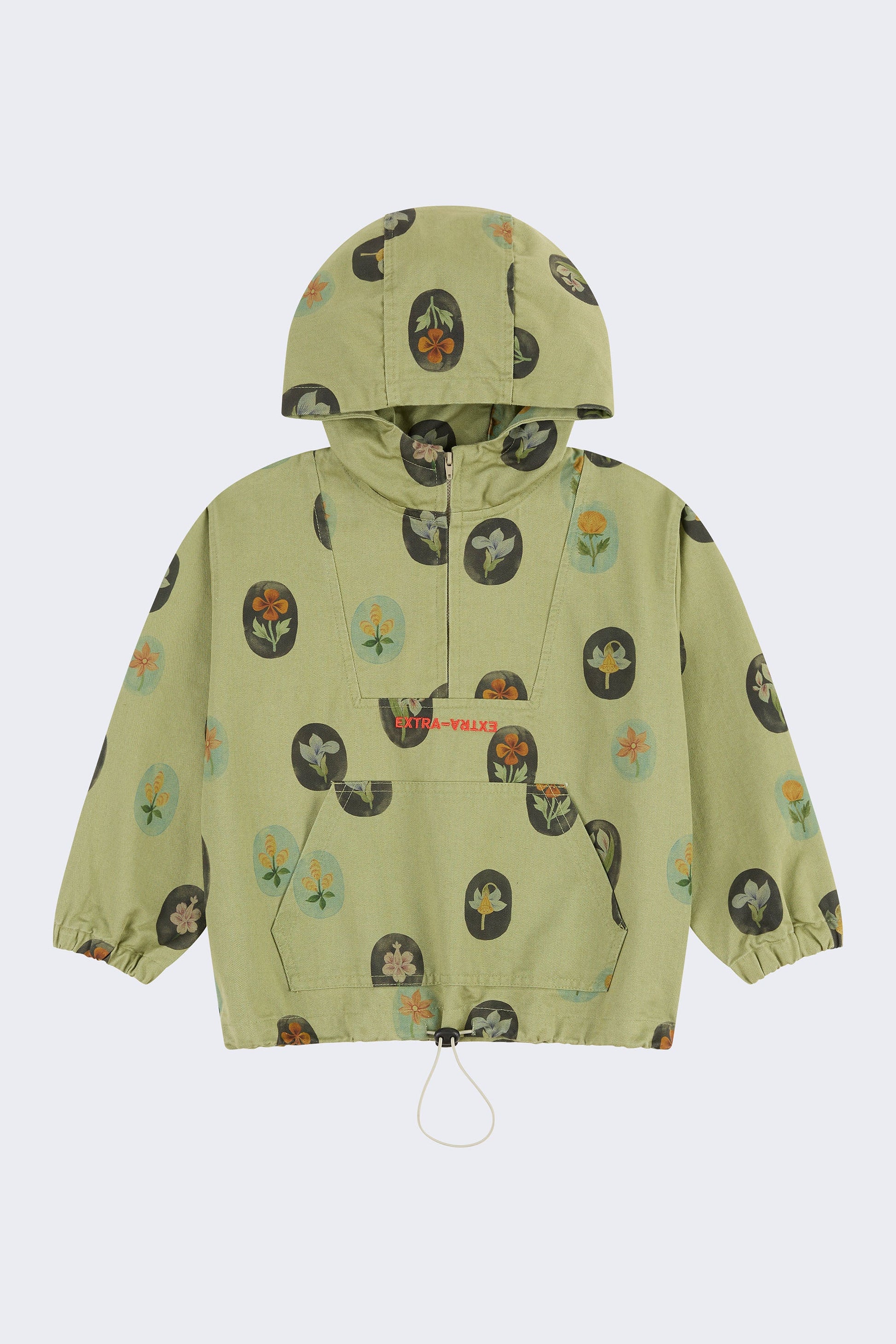 A light pullover hooded jacket style with half zip, printed in our Anti-Floral repeat on sage green cotton twill. The pullover has a kangaroo pocket, elastic sleeves and an adjustable hem with elastic cord and plastic stopper. It is finished with an embroidered EXTRA-EXTRA logo on the front panel. Wear straight, long and oversized or cinch in the hem for a more voluminous fit. Made in Korea.