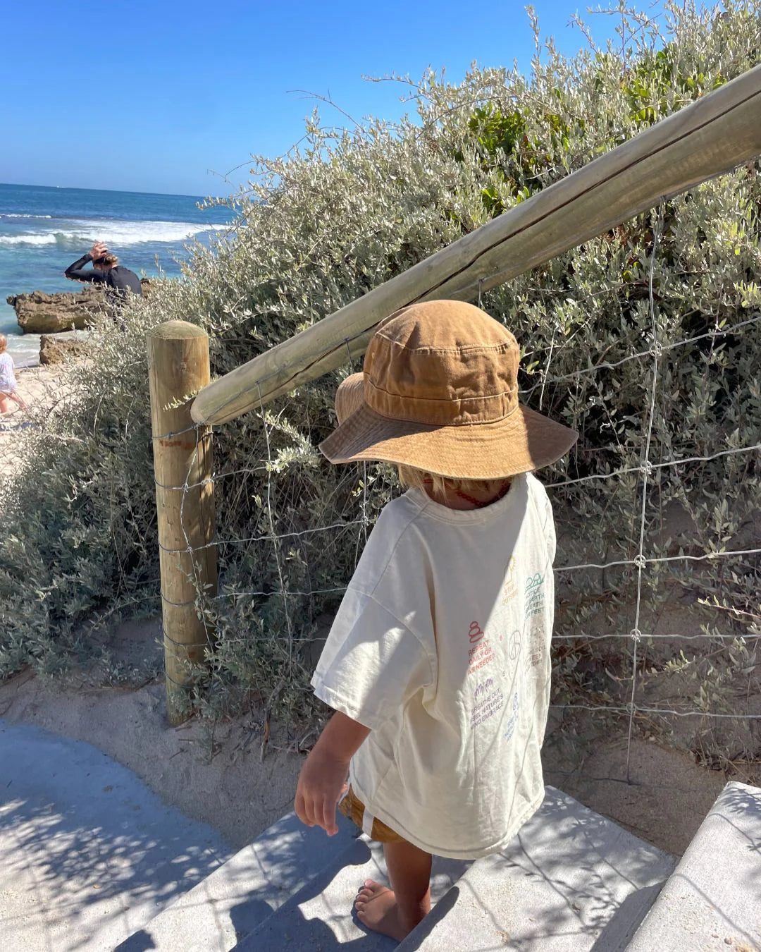 our classic wide-brim sun hat designed for long beach days, salty hair and your little sun lovers everyday adventures.