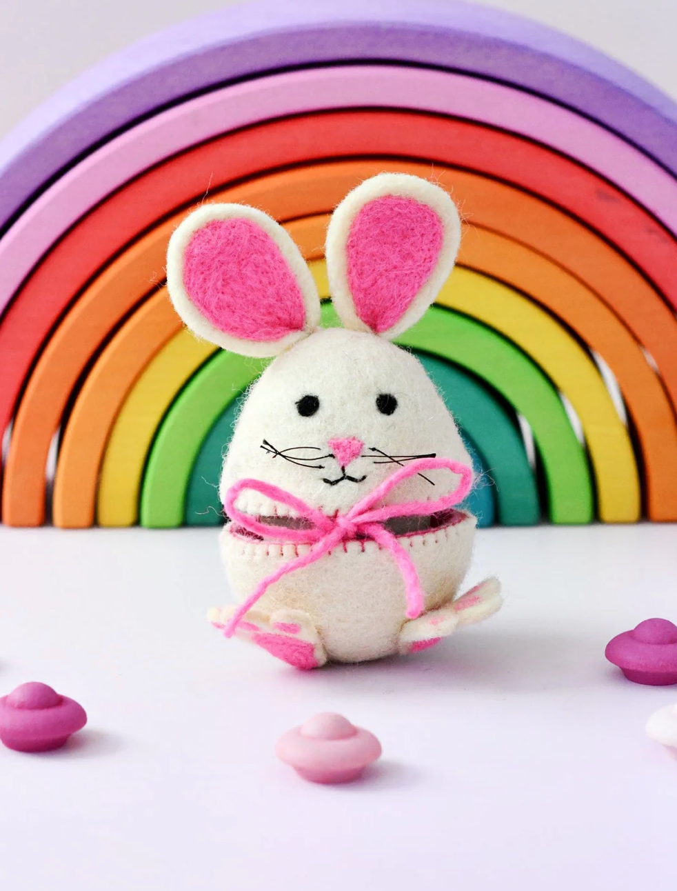Open the soft felt cover to reveal a charming pink interior, adding a sweet surprise. Whether it’s part of an Easter basket, an egg hunt, or small world play, this charming felt cover makes every surprise even more special.