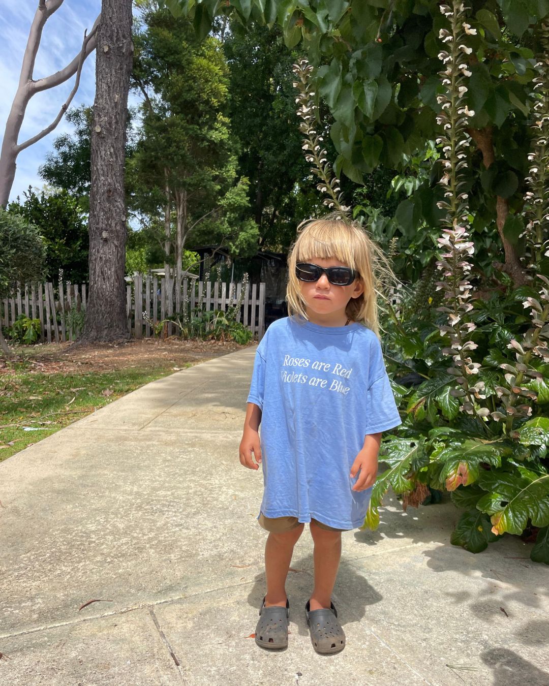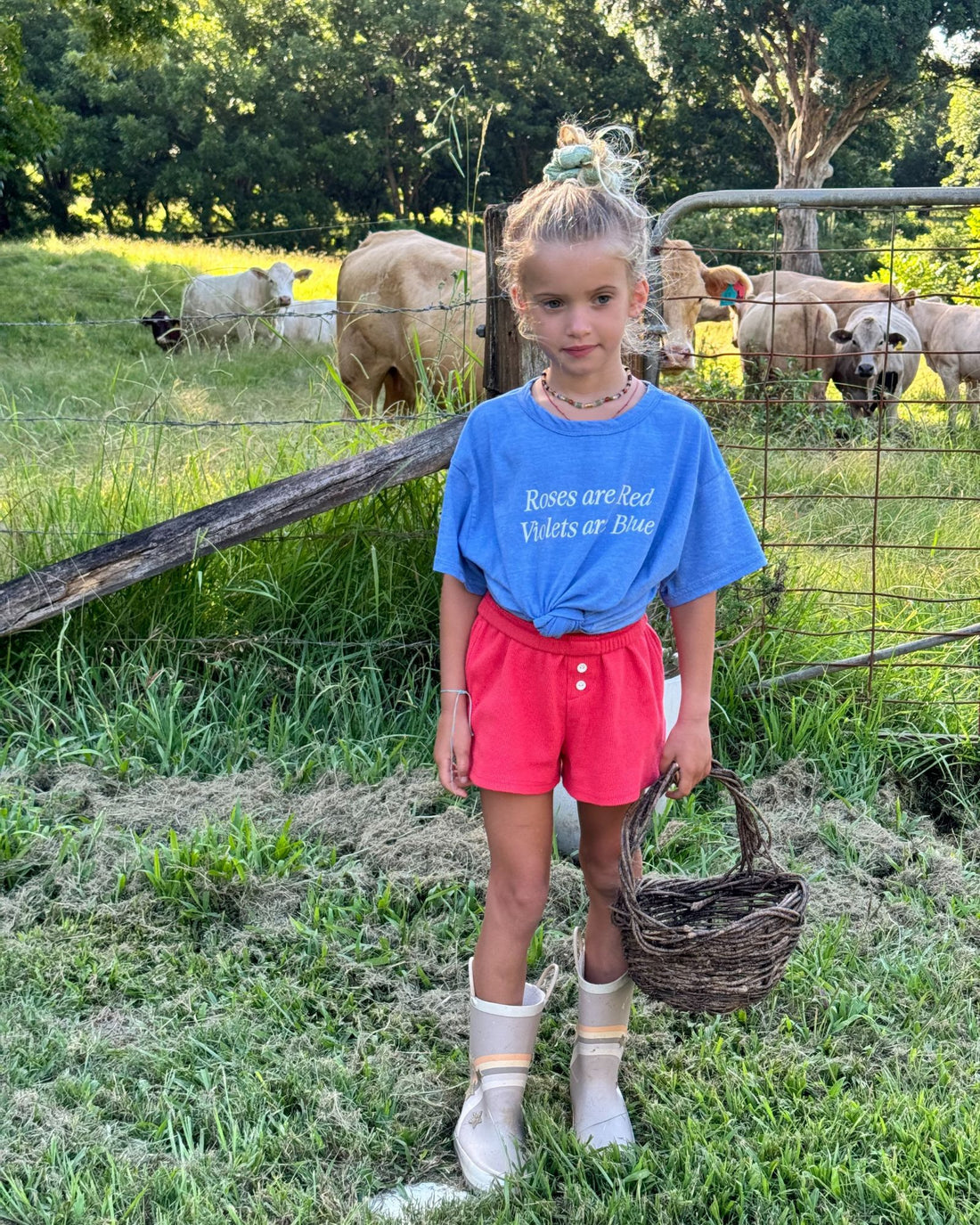 a premium, soft washed cotton tee with a relaxed, boxy fit and a self-fabric neckline. Our Roses Are Red graphic is printed across the front in milk.