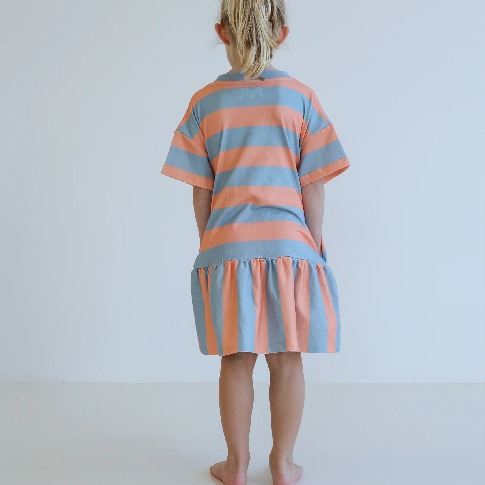 An unexpected pairing, and all the prettier for it. Bold stripes in Seafoam and Sherbet meet a relaxed drop-shoulder, drop-waist silhouette. Finished with navy OLLE floral embroidery at the chest, side entry pockets, and plenty of room to play.