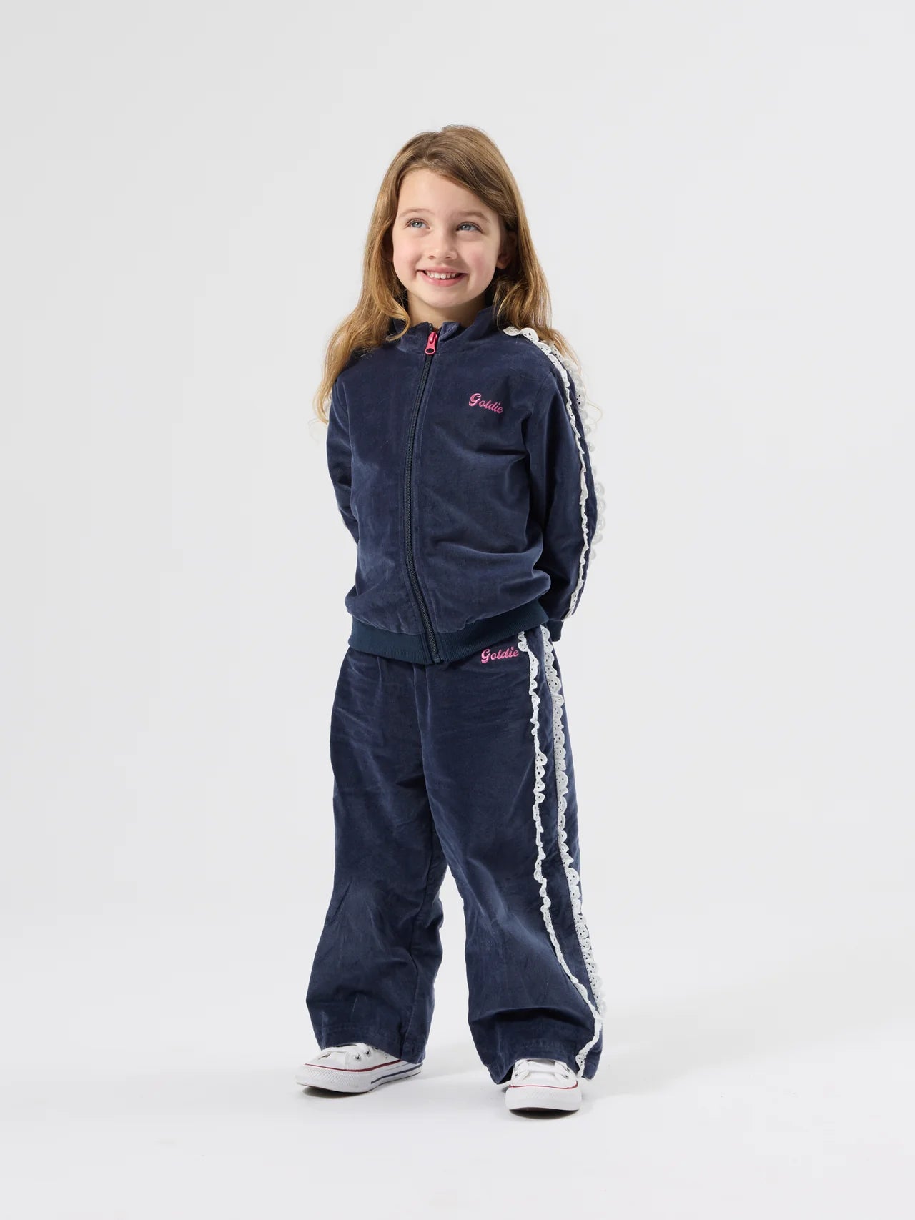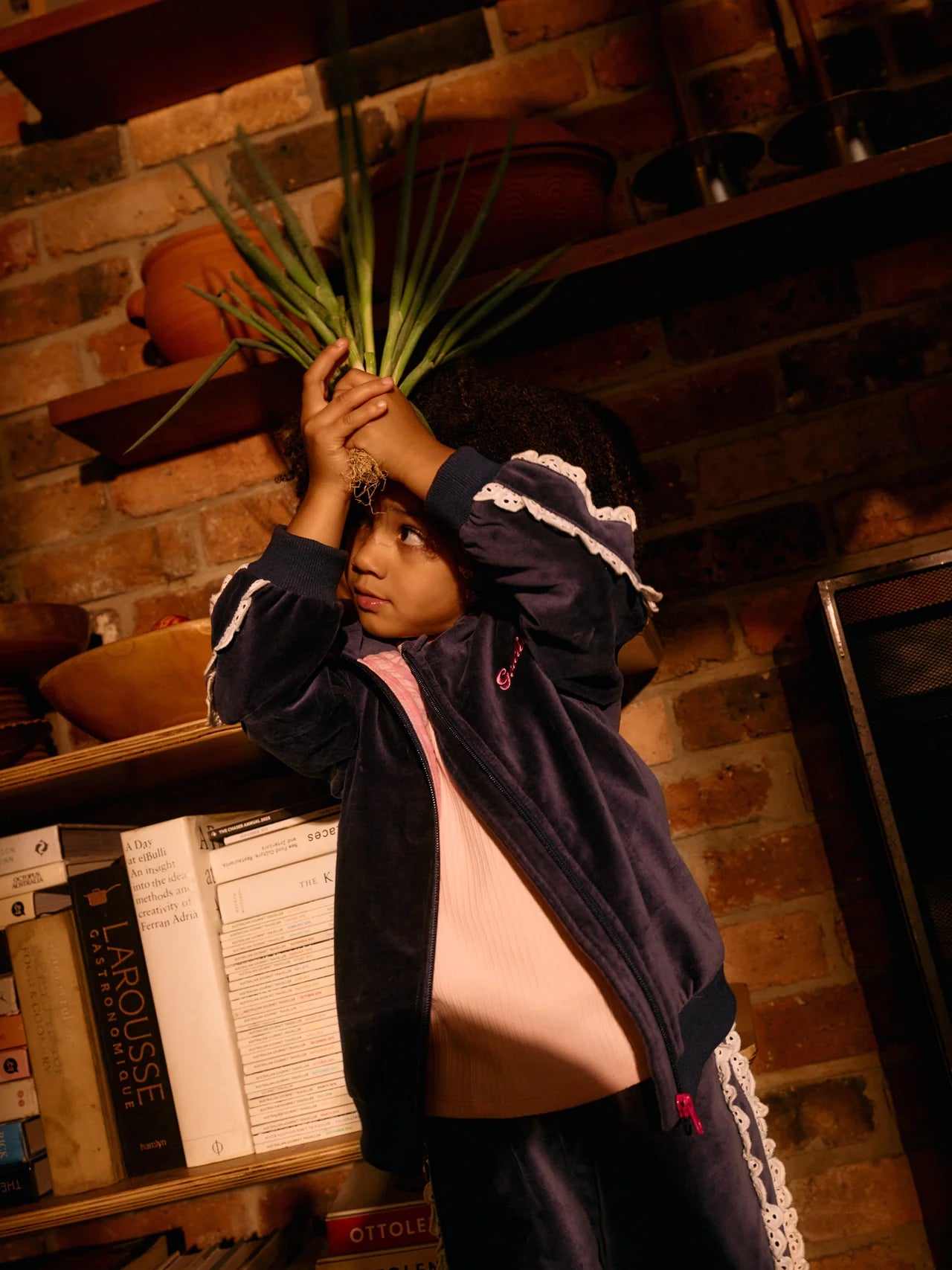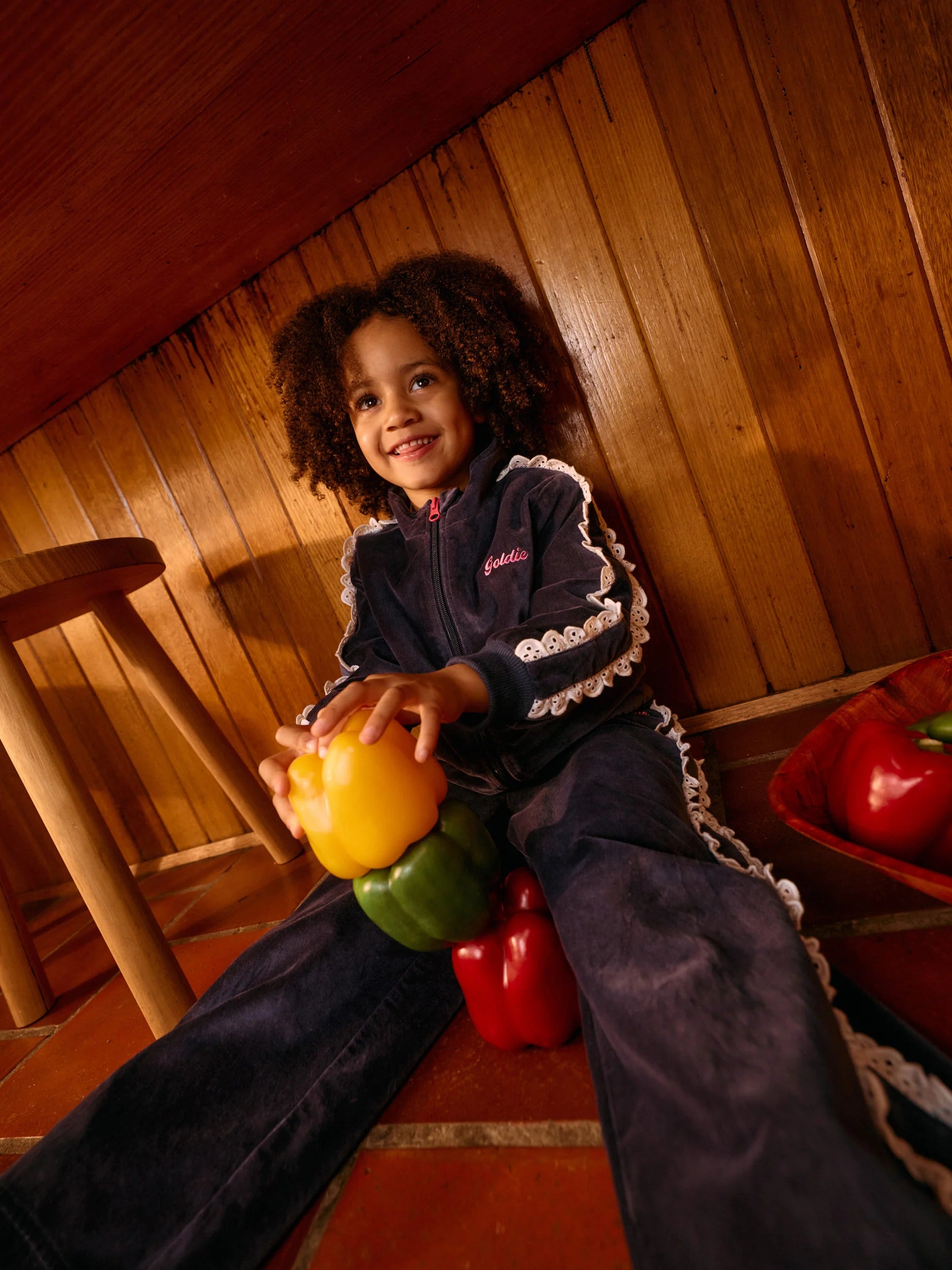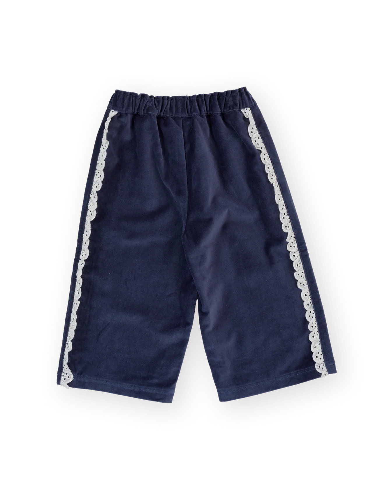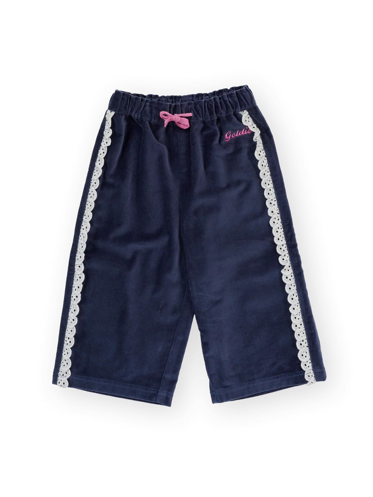 Ultra cool wide-leg pants with an elastic waist and broderie anglaise tracks - cosy, easy to wear, and perfect paired with a simple tee or the matching sweat jacket.